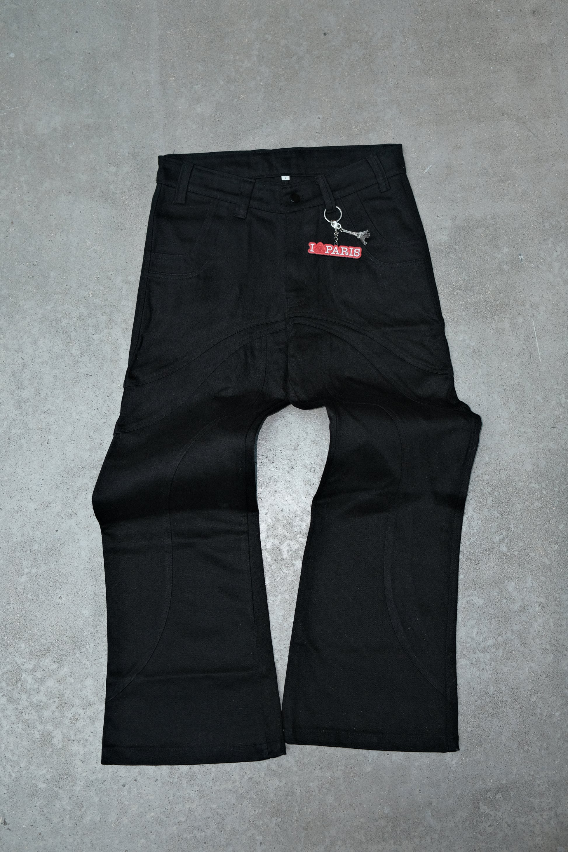 Jean flare noir brodé à empiècements techniques "I Love Paris"